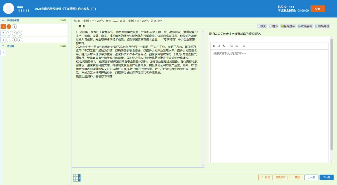 高级经济师考试的题型包括案例分析题和论述题等主观题,需要考生在电脑上输入大量的文字内容。如果考生的打字速度较慢,可能会导致答题时间不够用,无法完成所有的题目。提前参加机考可以让考生有更多的时间练习打字,提高打字速度和准确性,从而在正式考试中能够更快地完成答题。所以熟悉机考环境和电子化试题是非常有必要的,建议大家多多参与机考练习手感,多熟悉计算器使用~
