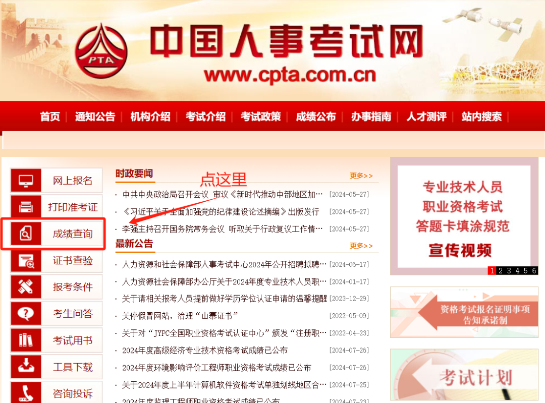 ▶ 第一步:登录中国人事考试网,点击左侧的“成绩查询”栏目。