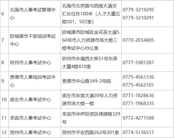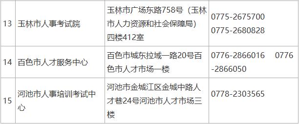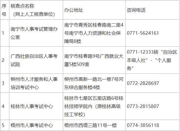 二、广西全区人事考试组织机构(核查点)地址及联系方式如下: