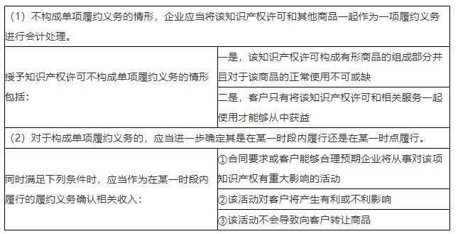 企业向客户授予的知识产权,常见的包括软件和技术、影视和音乐等的版权、特许经营权以及专利权、商标权和其他版权等。企业向客户授予知识产权许可的,应当按照要求评估该知识产权许可是否构成单项履约义务。